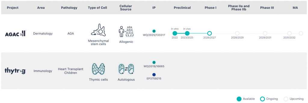 Our pipeline is focused on unlocking the potential of advanced cellular therapies through allogeneic cells, by exploring investigational approaches for clinical areas with limited therapeutic options. We focus on the use of mesenchymal stem cells for regenerative tissue in dermatology. In addition, we are involved in external programs focused on inmune restoration using allogeneic cells, offering a scalable manufacturing infraestructure compliant with current European regulatory standards.